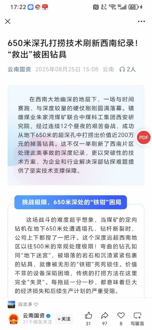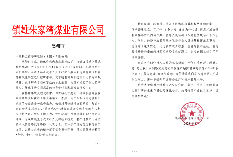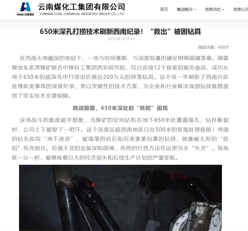 近日,中国煤科西安研究院在云南省镇雄煤业朱家湾煤矿成功打捞650米定向钻具,打捞作业深度与难度均刷新西南地区记录,被云南国资微信公众平台、云南煤化工集团有限公司专题报道。同时,西安研究院还收到镇雄朱家湾煤业有限公司感谢信。