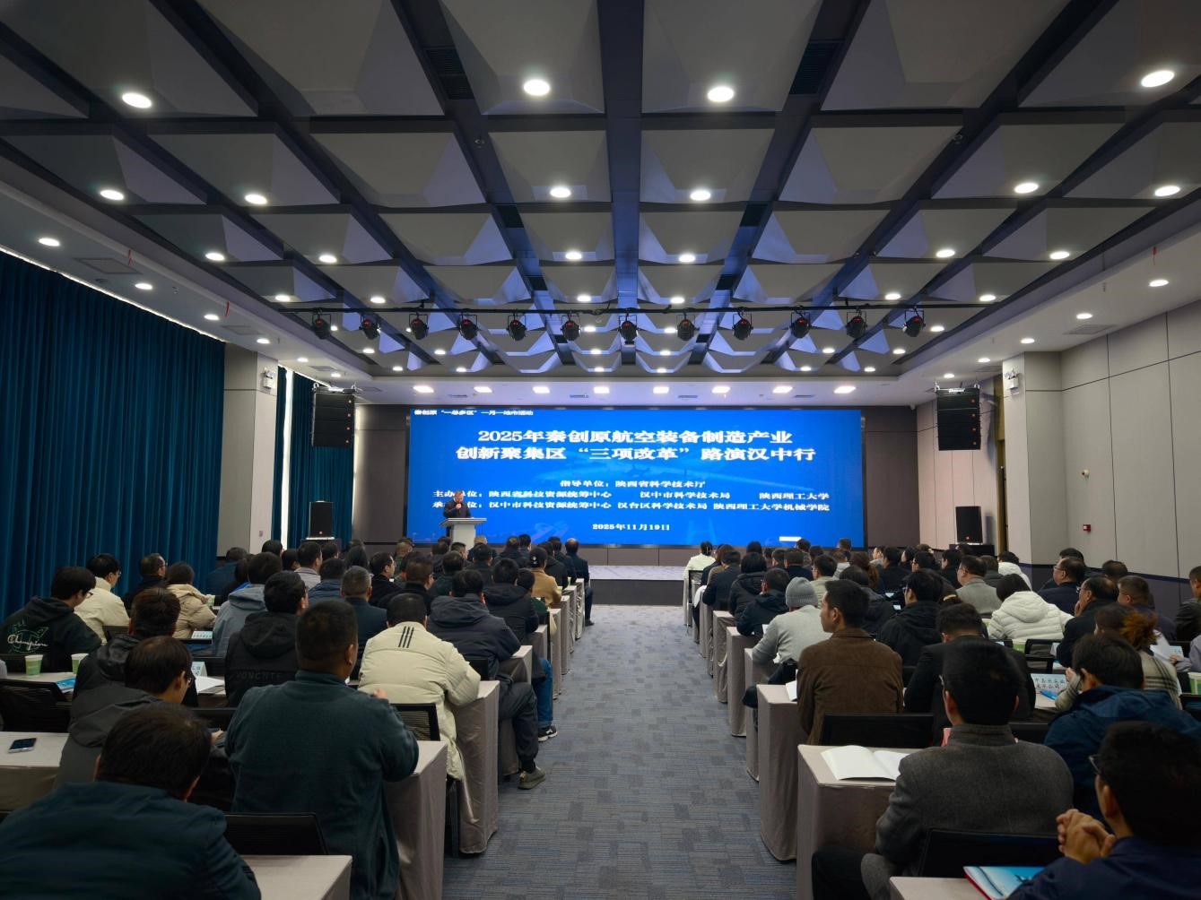 为打好教育科技人才体制机制一体改革硬仗,聚力构建秦创原“一总多区”协同创新发展格局,11月19日,由省科技厅指导,省科技资源统筹中心(省秦创原创新促进中心)、汉中市科学技术局主办,汉中市科技资源统筹中心(秦创原(汉中)创新促进中心)、汉台区科学技术局和陕西理工大学承办的秦创原“一总多区”一月一地市2025年秦创原航空装备制造产业创新聚集区“三项改革”路演活动在汉中举行。省科技资源统筹中心副主任杜学军,汉中市科技局党组书记、局长陈珊,陕西理工大学党委副书记黎晓峰出席并致辞。
