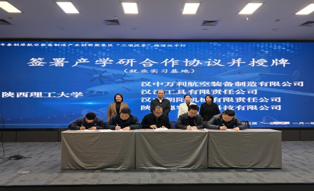 在签约环节,陕西理工大学分别与汉中万利航空装备制造有限公司、汉中朝阳机械有限责任公司、陕西德容航空科技有限公司、汉江工具有限责任公司签订产学研合作(就业实习基地)协议、科技副总合作协议、优秀研究生进入企业开展科研工作协议并颁发科技副总聘书和产业导师聘书。
