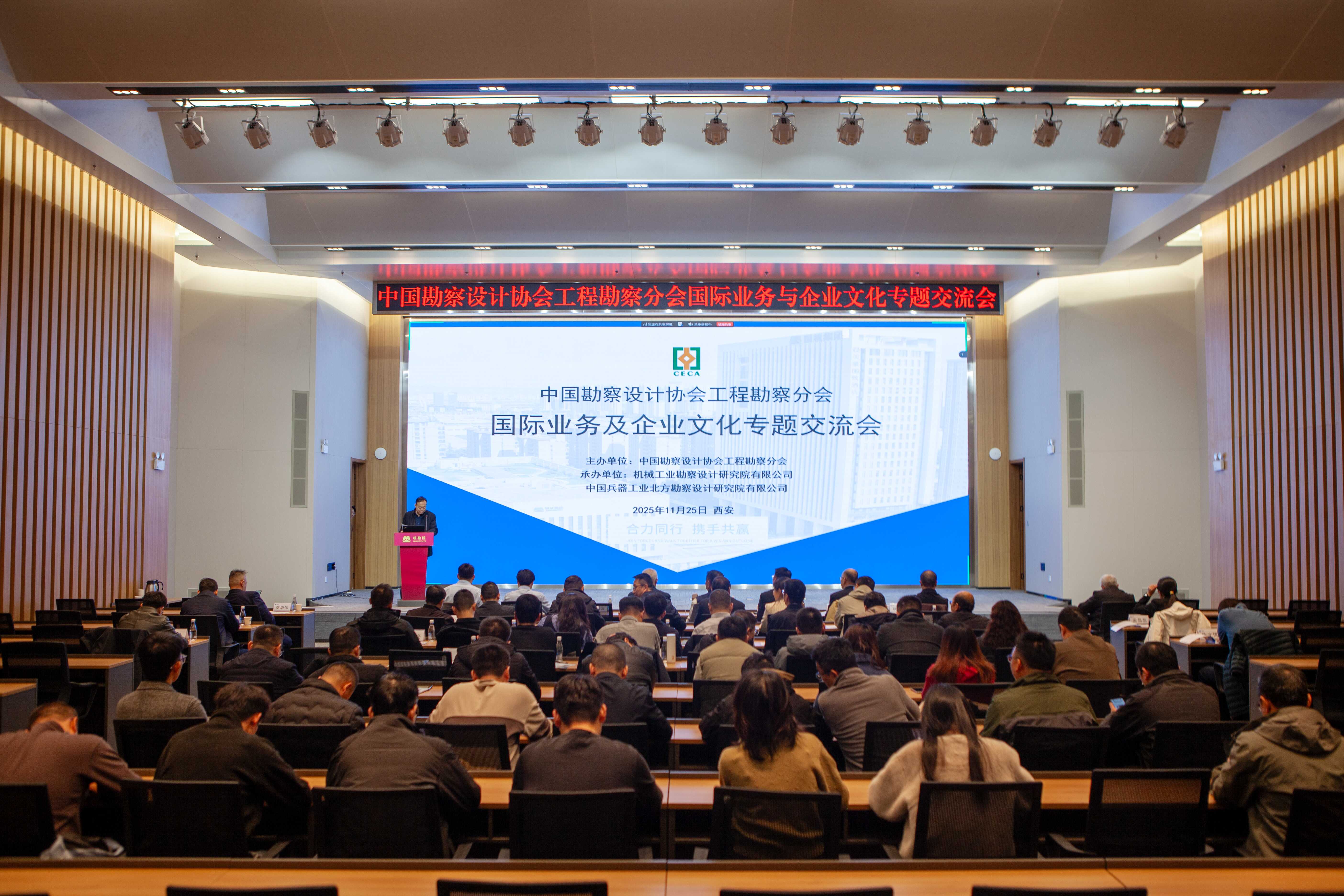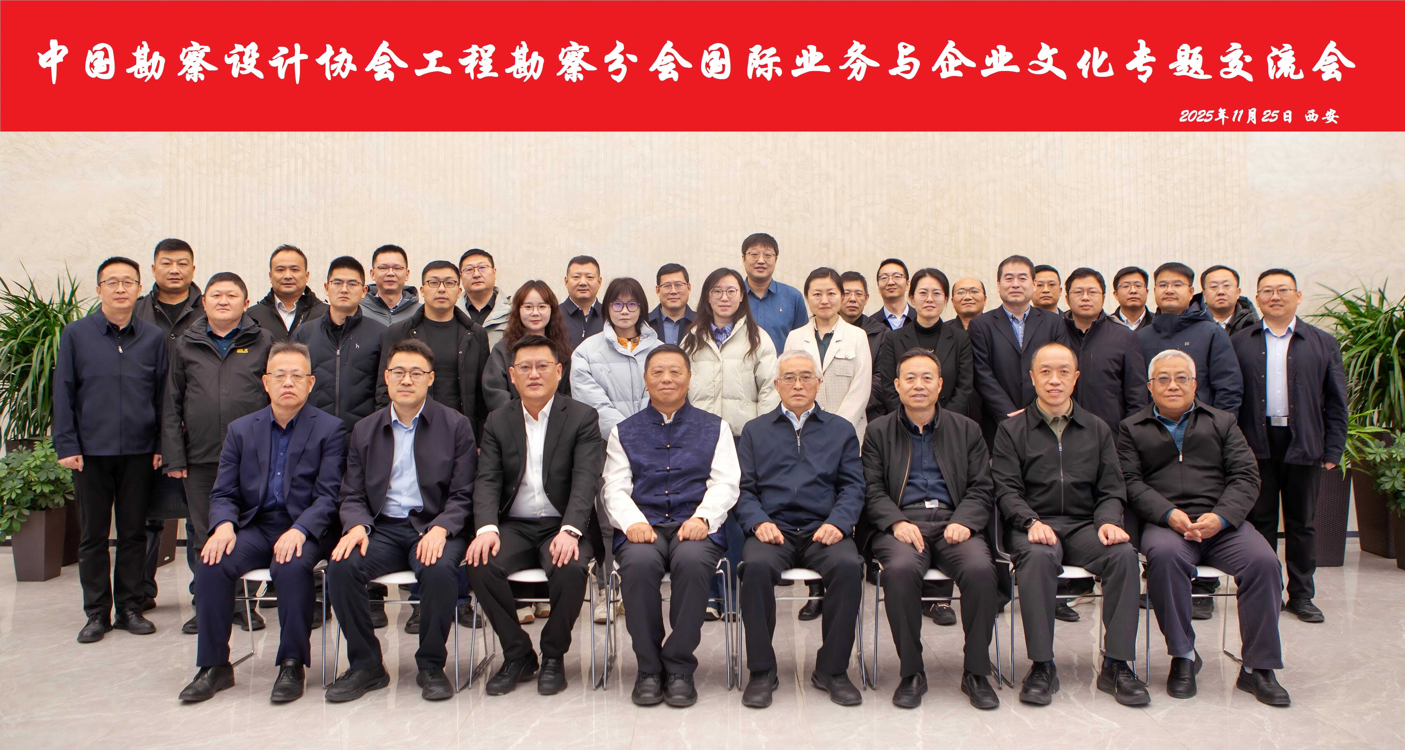 2025年11月25日,中国勘察设计协会工程勘察分会国际业务及企业文化专题交流会在西安召开。会议以“精益管理风险防控助力企业国际业务高质量发展,文化铸魂价值引领赋能企业基业长青”为核心主题,为工程勘察行业搭建聚焦国际业务与企业文化建设的交流平台。中国勘察设计协会副理事长、工程勘察分会会长徐宏声,中国勘察设计协会副秘书长、工程勘察分会秘书长宁俊栋,工程勘察分会副会长李华伟、吴浩出席会议,国际业务工作专班及宣传培训工作专班成员代表共30余人参加会议。会议由机械工业勘察设计研究院有限公司和中国兵器工业北方勘察设计研究院有限公司联合承办。