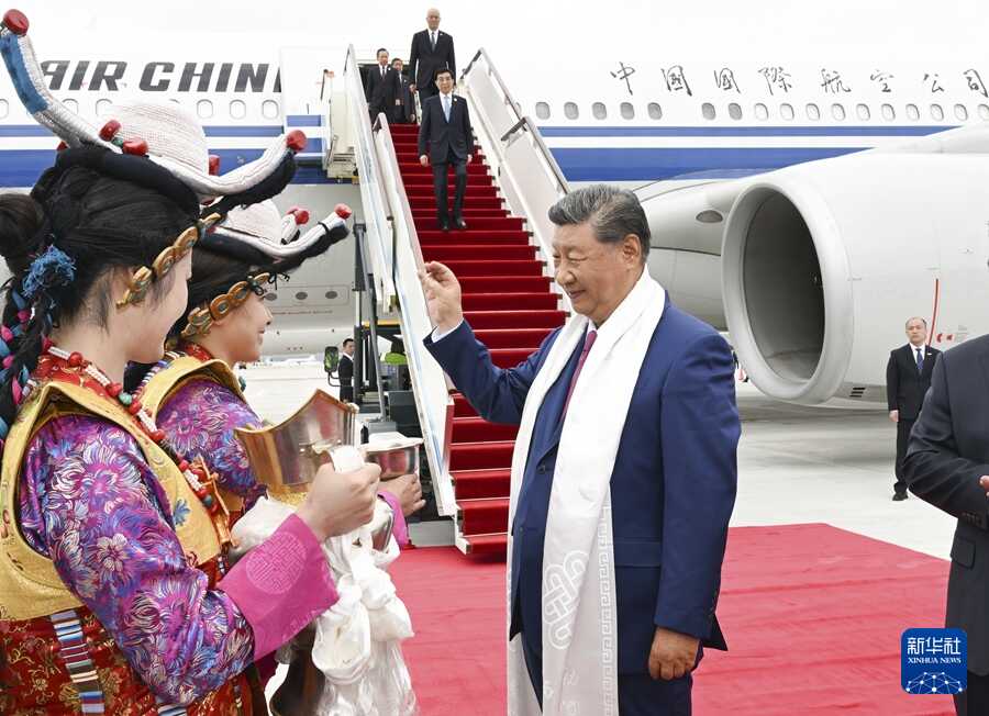 西藏自治区党委书记王君正、自治区人大常委会主任严金海、自治区人民政府主席嘎玛泽登、自治区政协党组书记刘江等在舷梯下迎候。习近平走下舷梯时,王君正敬献哈达,礼仪人员敬献切玛和青稞酒。各族群众代表身着节日盛装,挥动红旗和五彩花束,跳起欢快的民族舞蹈,欢迎总书记的到来,表达对总书记的衷心祝福。
