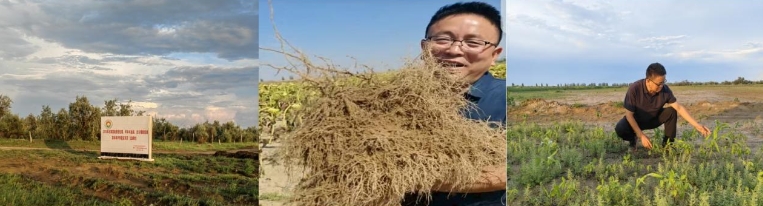 试验区2024年向日葵植株根系生长状况(中)及刚经历暴雨灾害的倒茬轮作的豆苗(右)。