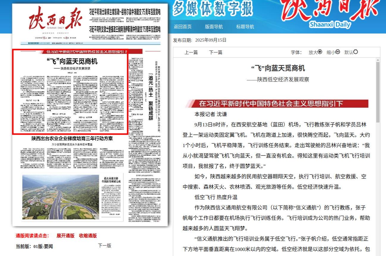 如今,陕西越来越多的民用航空器翱翔天空,执行飞行培训、航空救援、空中搜索、森林灭火、农林喷洒、观光旅游等任务。低空经济快速升温。