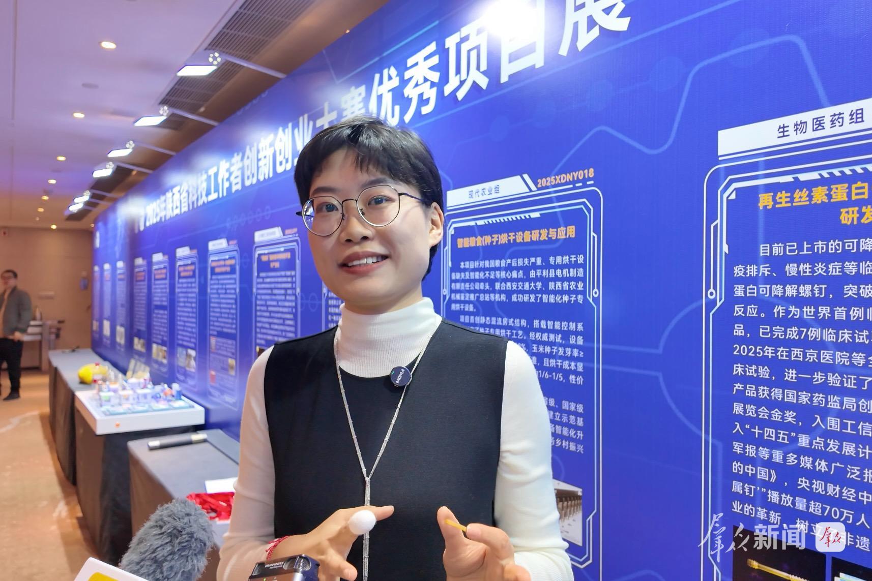 “传统金属骨科内固定物在骨骼愈合后常需二次手术取出。而我们研发的丝素蛋白螺钉,原料来自蚕丝,突破了传统金属材料的局限,不仅能在患者体内安全降解,还能有效促进骨愈合,且无免疫排斥反应。”《再生丝素蛋白骨植入器械的临床研发与转化》项目成员、西京医院骨科主管技师陈旭在展示区内向记者介绍,她一手持一枚看似寻常的浅黄色螺钉,一手握着雪白的蚕丝茧。