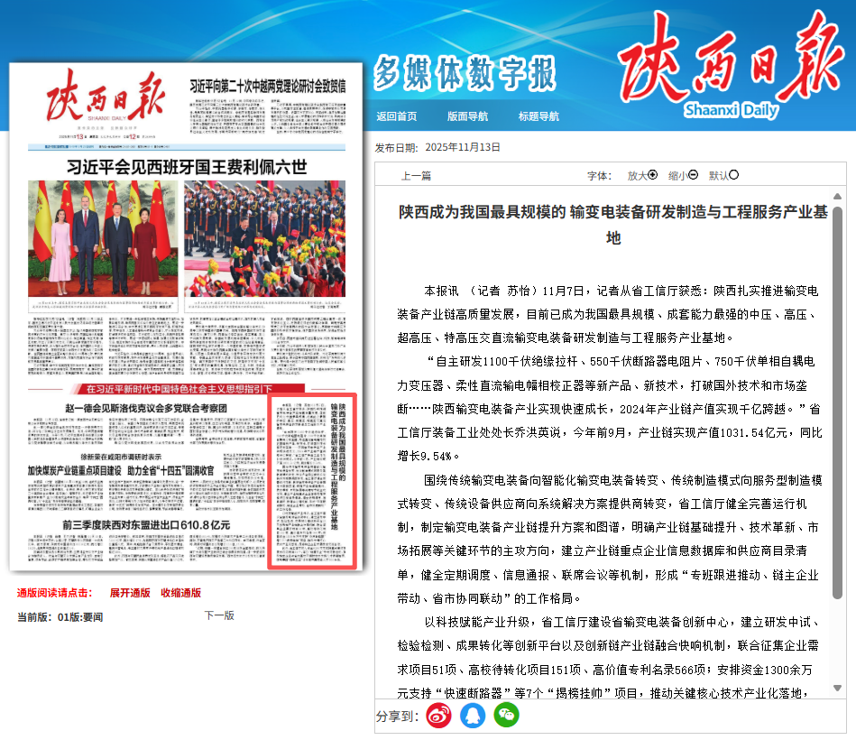 11月7日,记者从省工信厅获悉:陕西扎实推进输变电装备产业链高质量发展,目前已成为我国最具规模、成套能力最强的中压、高压、超高压、特高压交直流输变电装备研发制造与工程服务产业基地。