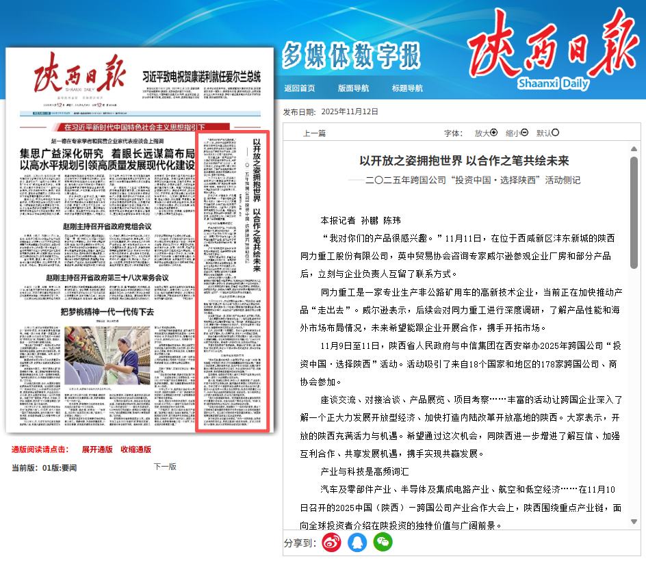 “我对你们的产品很感兴趣。”11月11日,在位于西咸新区沣东新城的陕西同力重工股份有限公司,英中贸易协会咨询专家威尔逊参观企业厂房和部分产品后,立刻与企业负责人互留了联系方式。