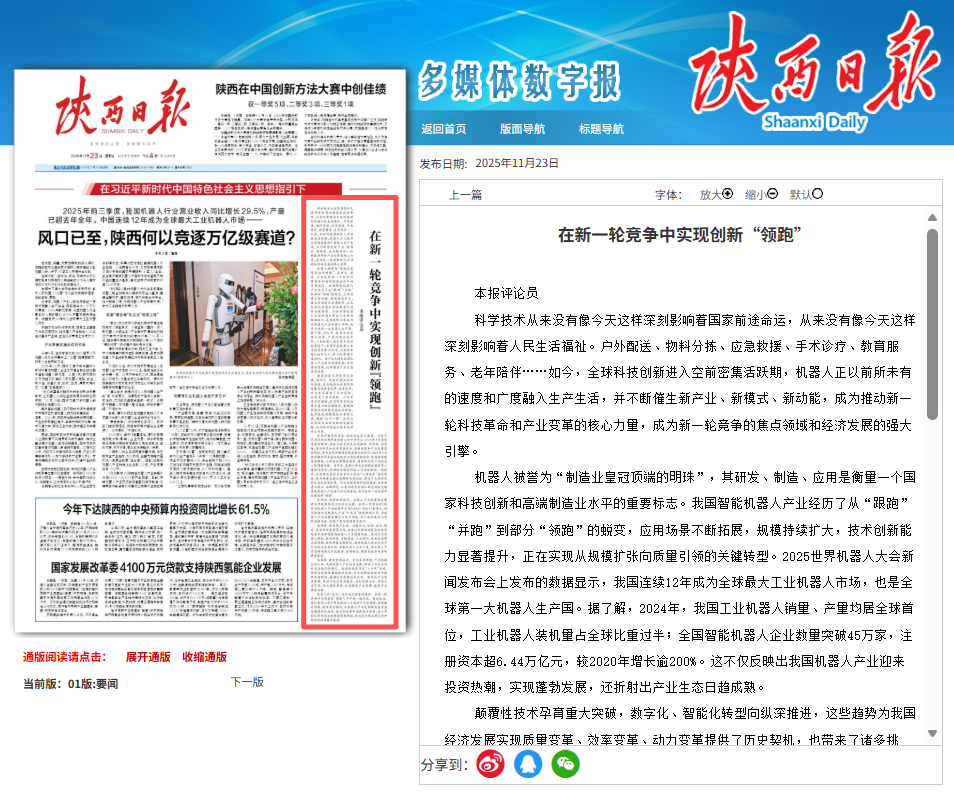 陕西科教资源富集,创新综合实力雄厚。习近平总书记对陕西科技创新工作十分关心,2015年2月来陕考察时强调,要把这些资源充分挖掘好、利用好、滋养好,推动科技和经济紧密结合、创新成果和产业发展紧密对接,努力在创新驱动发展方面走在前列;2023年5月在听取陕西省委和省政府工作汇报时指出,陕西要实现追赶超越,必须在加强科技创新、建设现代化产业体系上取得新突破。近年来,陕西以西安区域科技创新中心建设为牵引,持续深化教育科技人才体制机制一体改革,扎实推进秦创原体系化升级和“三项改革”协同增效,着力构建支持全面创新体制机制,营造了良好的创新生态和政策环境。作为我国重要的创新高地,陕西要勇立潮头、奋楫争先,以争当时代弄潮儿的志向和气魄竞逐机器人产业这个万亿级赛道,努力在新一轮竞争中实现创新“领跑”。