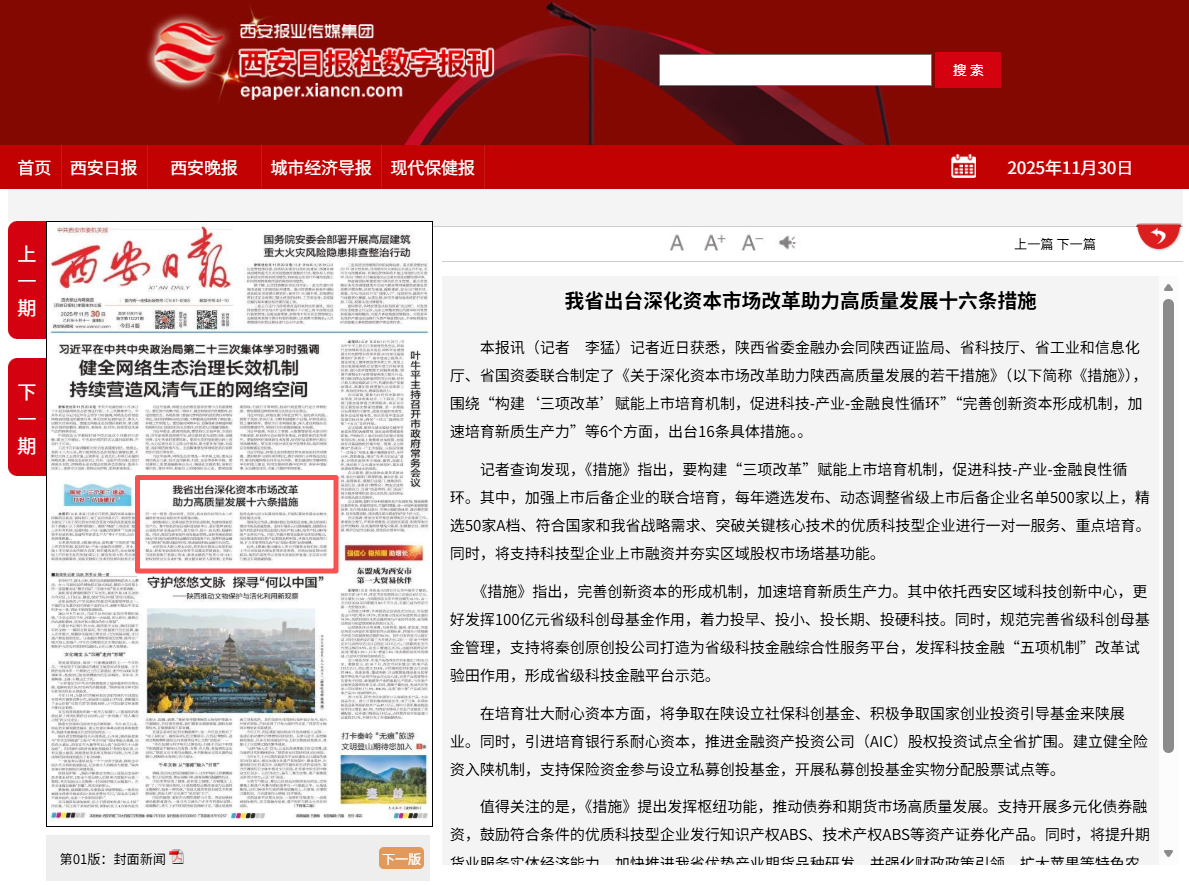 记者近日获悉,陕西省委金融办会同陕西证监局、省科技厅、省工业和信息化厅、省国资委联合制定了《关于深化资本市场改革助力陕西高质量发展的若干措施》(以下简称《措施》),围绕“构建‘三项改革’赋能上市培育机制,促进科技-产业-金融良性循环”“完善创新资本形成机制,加速培育新质生产力”等6个方面,出台16条具体措施。。