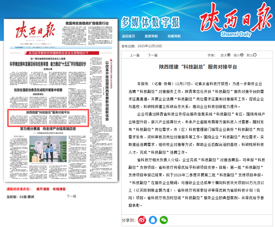 12月17日,记者从省科技厅获悉:为进一步做好企业选聘“科技副总”对接服务工作,陕西常态化开放“科技副总”服务对接平台的需求征集通道,开展企业选聘“科技副总”岗位需求征集和对接服务工作,促成企业与高校、科研院所建立科研合作关系,推动企业科技创新能力提升。
