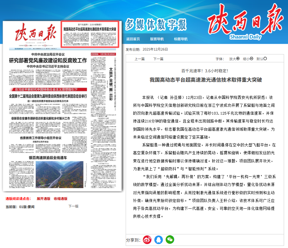 “我们采用‘先解耦,再补偿’的方案,构建了‘平台—机构—光束’三级系统的数学模型,通过全面分析扰动来源,并结合刚体动力学模型,量化各扰动来源对光束指向误差的影响程度,从而控制激光通信系统进行毫秒级的实时预测和主动补偿,确保光束始终锁定目标。”项目团队负责人王轩介绍,该技术体系可广泛应用于各类高扰动平台,为构建下一代高速、安全、可靠的空天地一体化信息网络提供核心技术支撑。