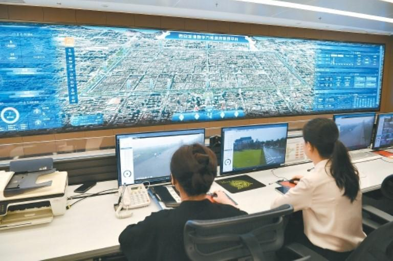工作人员通过“西安城墙数字方舱综合管理平台”开展工作(2025年9月10日摄)。 (新华社记者 邵瑞 摄)