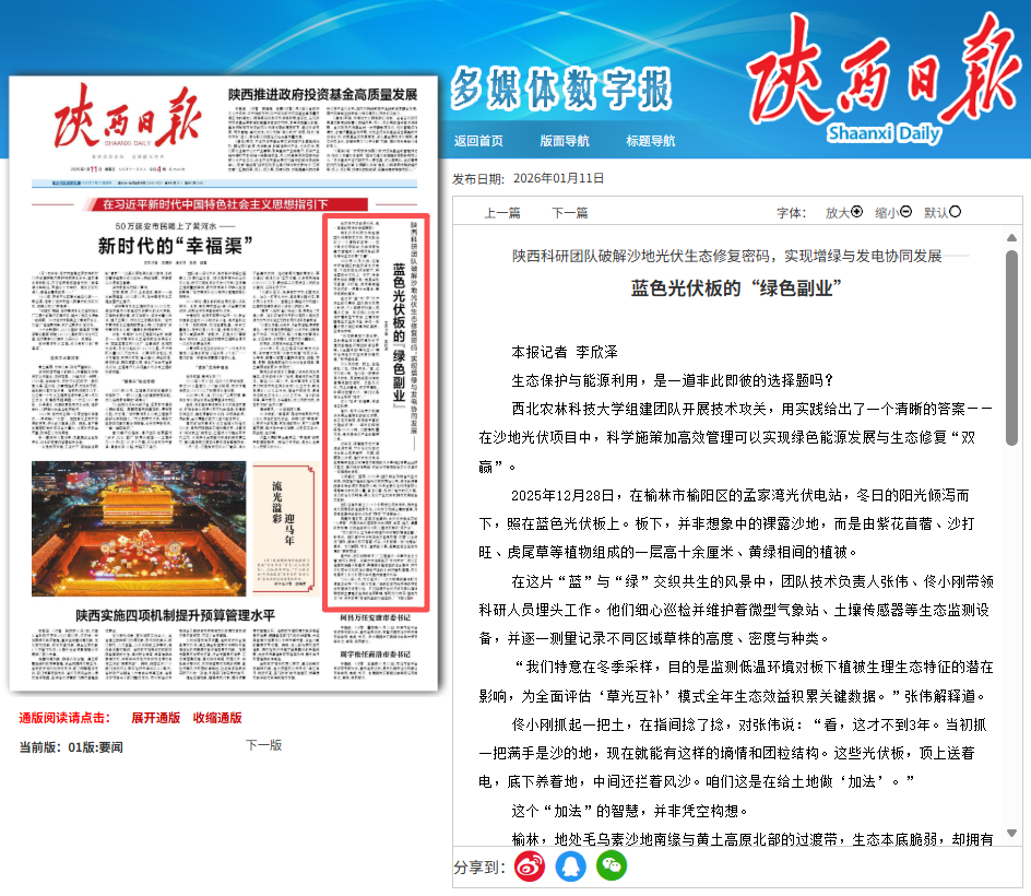 西北农林科技大学组建团队开展技术攻关,用实践给出了一个清晰的答案——在沙地光伏项目中,科学施策加高效管理可以实现绿色能源发展与生态修复“双赢”。