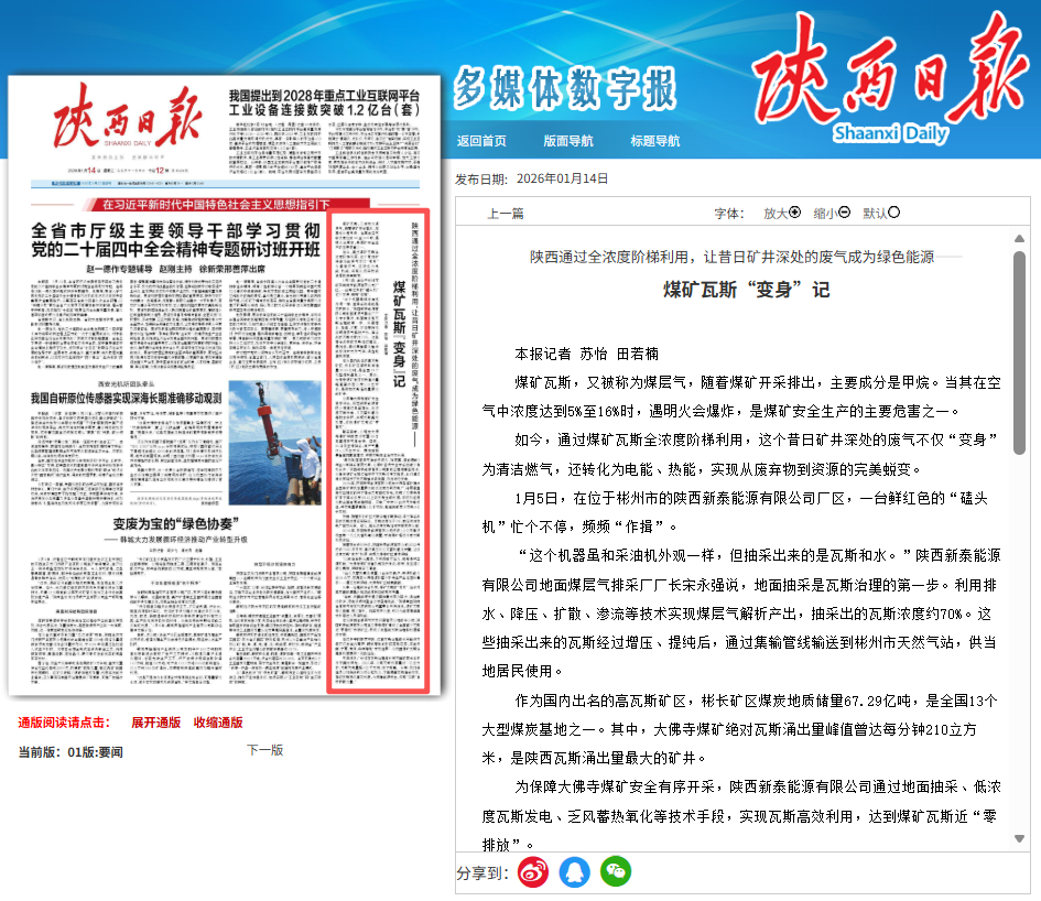 作为陕西省煤层气开发利用有限公司的子公司,陕西新泰能源有限公司在大佛寺煤矿建成了全国首个瓦斯近“零排放”示范矿区,形成了完整的瓦斯治理和利用解决方案。