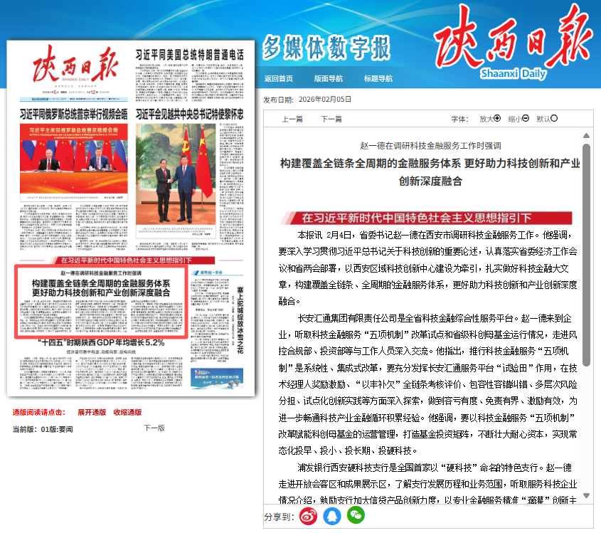 陕西日报:构建覆盖全链条全周期的金融服务体系 更好助力科技创新和产业创新深度融合