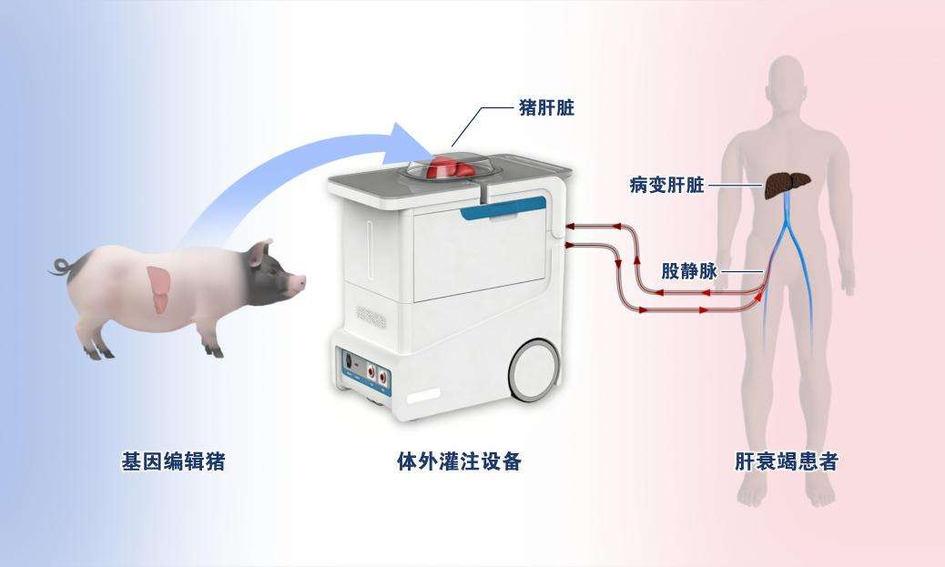 团队从一只由四川中科奥格生物科技有限公司潘登科教授团队提供的六基因编辑猪体内获得肝脏,将其与由中山大学第一附属医院何晓顺、郭志勇教授团队提供支持的常温机械灌注设备连接,组成异种猪肝脏与体外肝脏交叉循环系统。