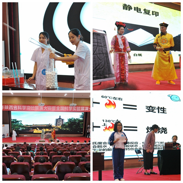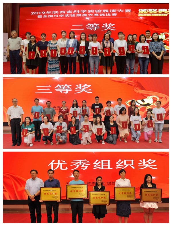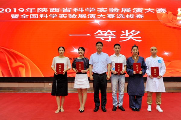 省科技厅、省教育厅、中科院西安分院领导为获奖选手颁奖。今年我省科学实验展演大赛精彩纷呈,一个个高水平的实验表演受到比赛现场观众的热情欢迎,呈现出参赛队伍多、赛前准备足、涉及专业广、表现形式优、现场气氛浓等鲜明特点。今后,我省将进一步创新办好科学实验大赛,办出特色、办出水平,办出品牌。我省还将推荐优秀团队参加9月下旬在合肥举行的全国科学实验展演大赛。